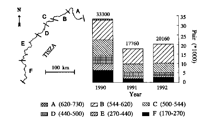 The size of the sub-population which breed on the Hungarian stretch of the River Tisza changed markedly between 1990-1992 (Fig. 1). There was a large decrease (-47%) in 1991, which was followed by an increase (+13.5%) in 1992.