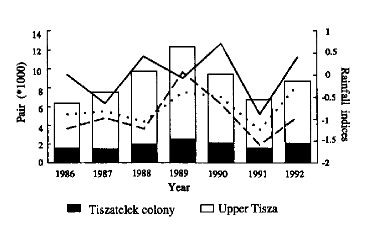 The wintering ground of western and northern European Sand Martin populations is in the Sahel zone of West Africa (Mead 1979). There are limited data suggesting that central European populations use the western African wintering ground, as Czecho-Slovakian breeding birds have been found in spring at Lake Chad (Mead 1979). There have been only two long-distance recoveries of Sand Martins ringed in Hungary. One of these bird was ringed as a juvenile at a colony in Tiszabercel (48 09' N, 21 39' E) in July 1985 was recaptured at Eilat, Israel (29 33' N, 34 55' E) in May 1986 whilst the other was ringed as juvenile at a colony in Tiszatelek (48 13' N, 21 47' E) in July 1989 and recaptured in Malta (36 03' N, 14 14' E) in May 1991. Hungarian birds may use different migration routes, but the role of the Sahel zone in the preparation for trans-Saharian flight in spring and in wintering may be essential. Drought in the Sahel, which lies at the southern edge of the Sahara, from the Atlantic to the Red Sea, has a severe effect on Sand Martin survival rates (Cowley 1979). The Sand Martin's feeding is associated with wetland habitats both in the migrating and wintering grounds and rainfall data from the Sahel provide indirect information about the condition and abundance of these habitats (Morel & Morel 1992). I used rainfall data from three separate areas of northern tropical Africa (northern Sahel, 10 - 17 N, 20 W - 5 E; southern Sahel, 3 - 10 N, 20 W - 5 E; central Sudan, 10 - 16 N, 22 - 37 E). These areas may lie on the migration route and wintering grounds of migrating Sand Martins which breed in central Europe. The rainfall data extended from May to October, when most of the annual precipitation occurs in these regions, and were in the form of Rainfall Anomaly Indices (Barring & Hulme, in press) with 1951-1980 as the reference period. The rainfall indices were applied to the year which followed the wet period. The migrating birds arrived in that area after the wet period and potential effects of the rainfall on the breeding population may detect in the following year when the migrating birds arrive on their breeding grounds.