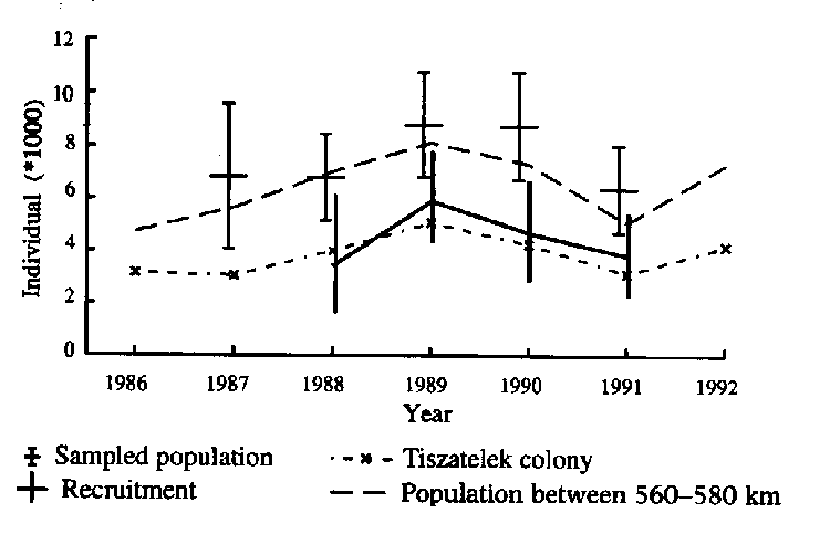 The colony size at Tiszatelek shows the same changes as found in the rest of the upper Tisza population (rs5=0.75; P<0.05) (Fig.2). Using the capture-recapture data of adult birds only, I estimated the abundance and recruitment using the program JOLLY (Model A; survival rate and recapture rate are time dependent (St,Pt); goodness of fit to the data (CHI2 df:12=16.7; n.s.). The estimated numbers shows the same changes as the surveyed numbers at Tiszatelek colony (Fig. 3). The size of the sampled sub-population is higher than the number of breeding birds at Tiszatelek colony and it is close to the number of birds which breed between the 560-580 km river stretch, including the Tiszatelek colony (Fig. 2). The highest recruitment by new breeders was in 1989 and after that there was a progressive decline until 1991. These changes coincided with the decline in the surveyed sub-population during this period. There was no detectable effect on the breeding numbers produced by the absence of second broods in 1987 and 1991. The late arrival of adults in the breeding area in 1987 and 1991 resulted in virtually no and less than 0.1% of the females raised second broods compared with the average of 20-30%.