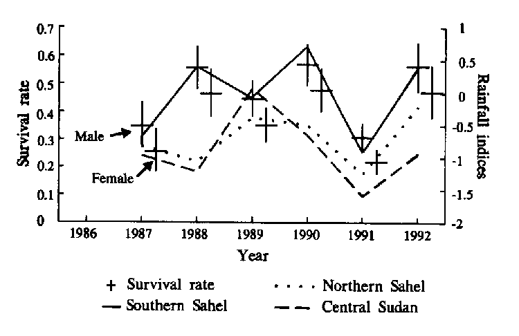 The estimated survival rates showed a significant positive correlation with the rainfall index of the Southern Sahel during the preceding wet season (rs4=0.94; P<0.05) (Fig. 4) but not with the other two rainfall indices (Northern Sahel rs4=0.60; n.s.; Central Sudan rs4=0.54; n.s.). After the two winters when the survival rates were the lowest (1986-87 and 1990-91) the birds returned to the breeding area two weeks later than usual and the frequency of second broods was very low.